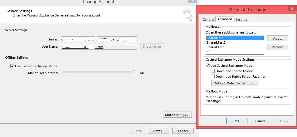 You mention that you turn on cached mode,is this under user mailbox or additional mailbox as shown below?