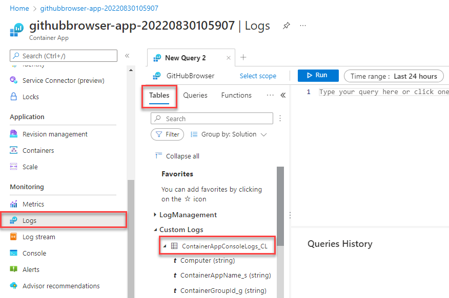 Expand the Custom Logs item to reveal the ContainerAppConsoleLogs_CL node. This table holds various logs for the container app that can be queried to troubleshoot problems.