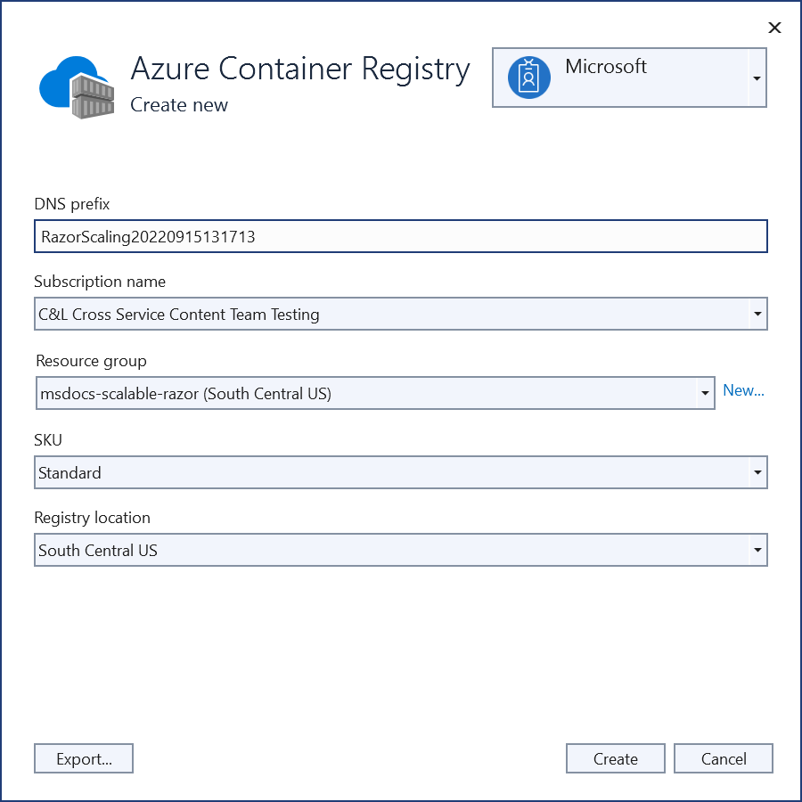 - Enter a name of scalablerazorkeys, leave the rest of the settings at their defaults, and then select Create.
