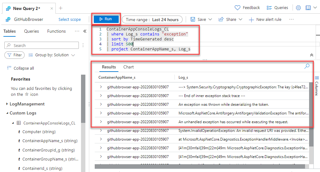 ContainerAppConsoleLogs_CL | where Log_s contains "exception" | sort by TimeGenerated desc | limit 500 | project ContainerAppName_s, Log_sThe preceding query searches the ContainerAppConsoleLogs_CL table for any rows that contain the word exception. The results are ordered by the time generated, limited to 500 results, and only include the ContainerAppName_s and Log_s columns to make the results easier to read.