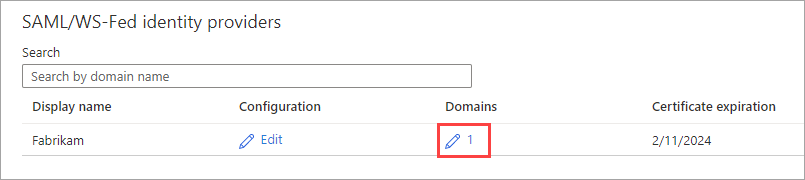 To edit the domains associated with the partner, select the link in the Domains column. In the domain details pane:
