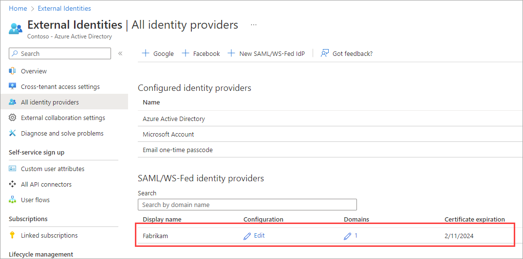 On the All identity providers page, you can view the list of SAML/WS-Fed identity providers configured and their certificate expiration dates. From this list, you can renew certificates and modify other configuration details.