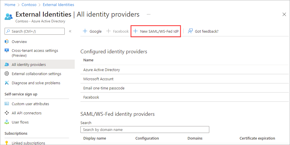 - External tenants: Add the SAML/WS-Fed identity provider to a user flow.
