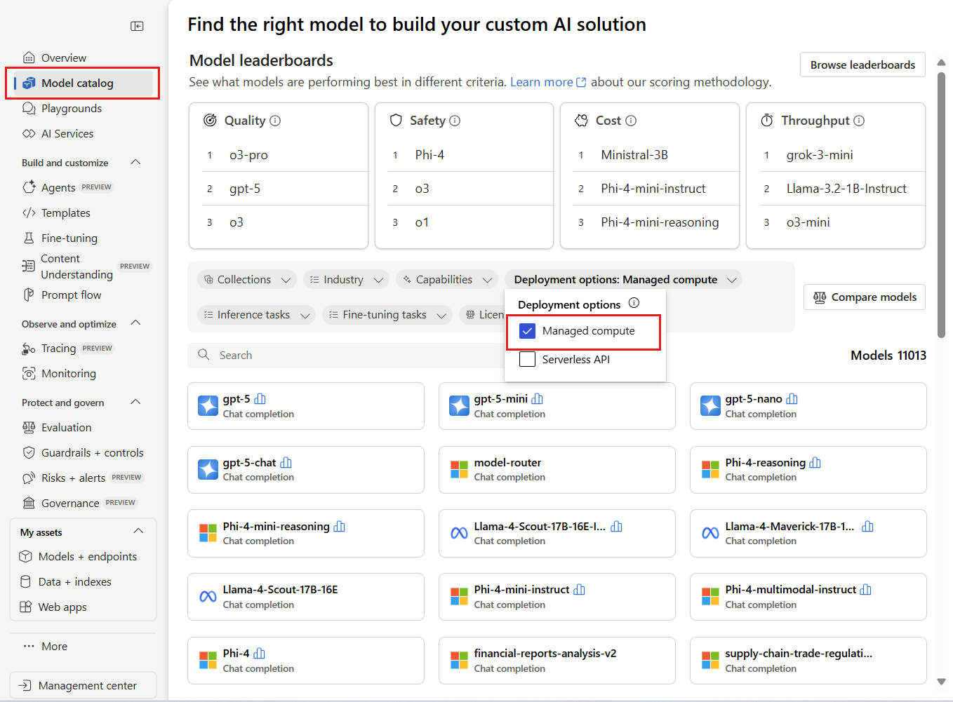 Screenshot of the model catalog interface with the Deployment options filter panel open, on the left showing Managed compute selected, and a grid of available model cards displayed on the right.