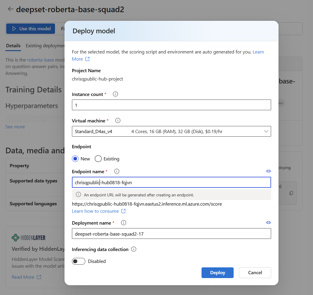 4. Select Deploy to create your deployment. The creation process might take a few minutes to complete. When it's complete, the portal opens the model deployment page.