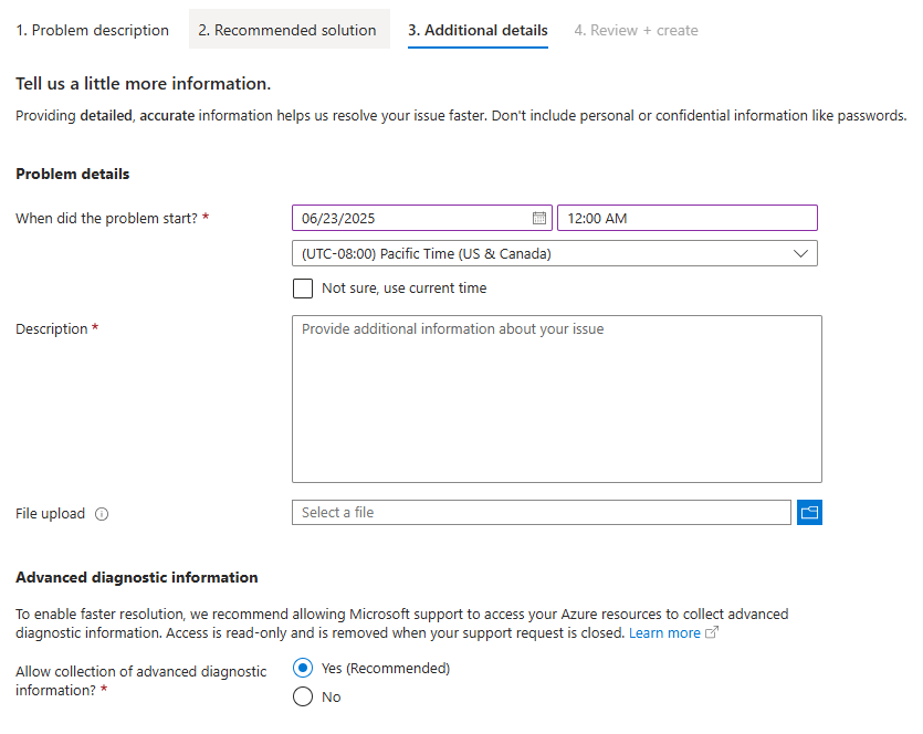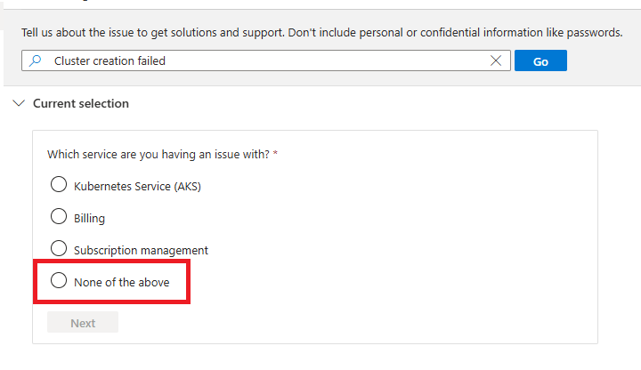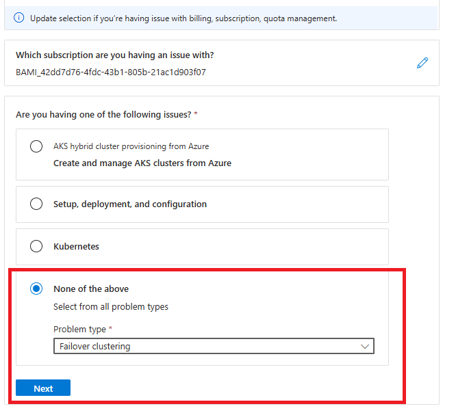 Select one of the predefined issues, or select None of the above if your issue doesn't relate to a specific predefined issue. Then select Next: