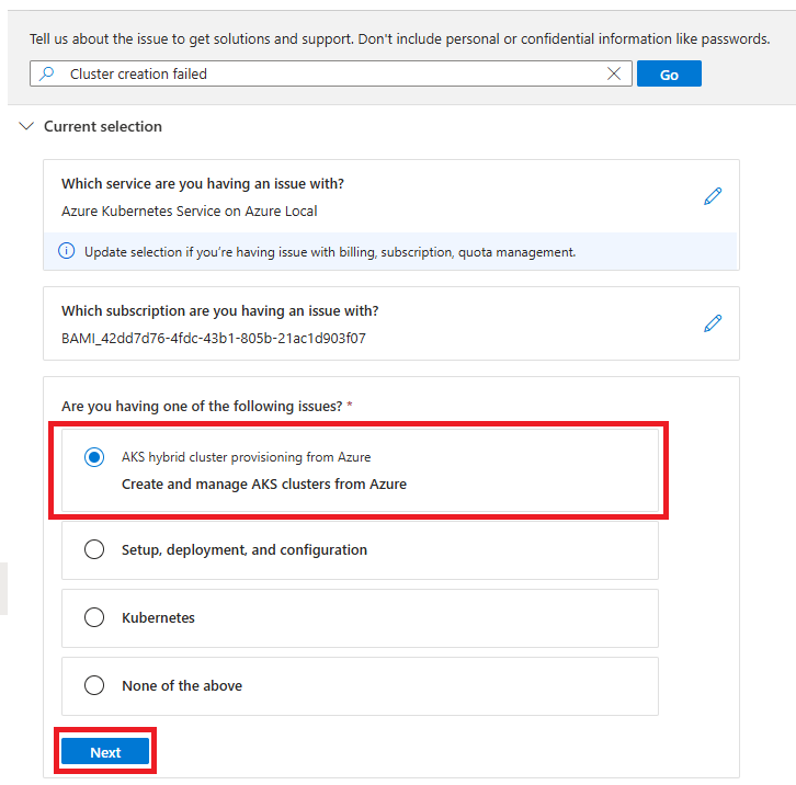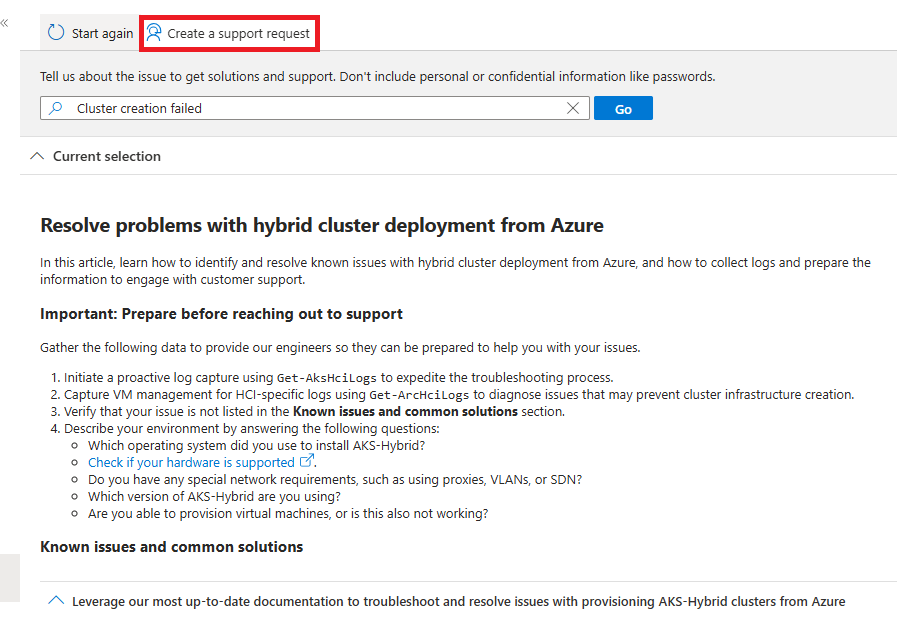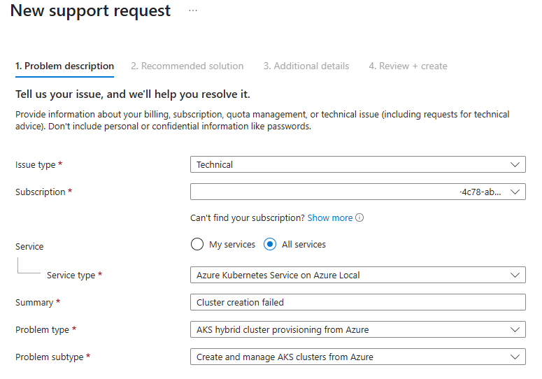 If you encounter an issue with AKS on Azure Local, this article describes how to open a support request.