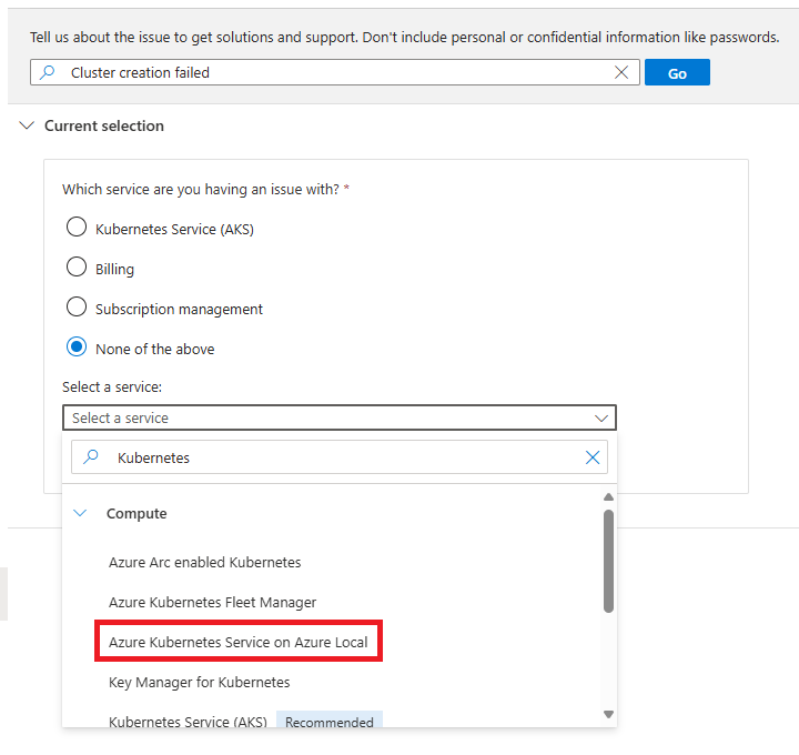 Select Azure Kubernetes Service on Azure Local from the dropdown list.