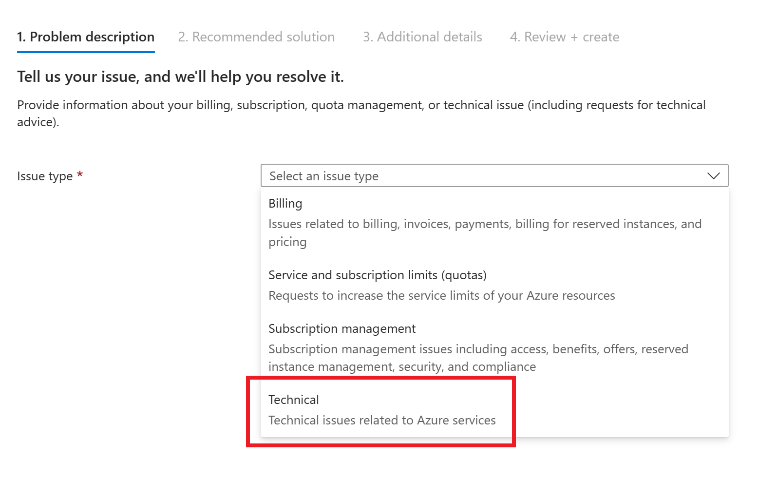 Select the appropriate Problem type from the dropdown menu for your issue (for example, Setup, deployment, and configuration).