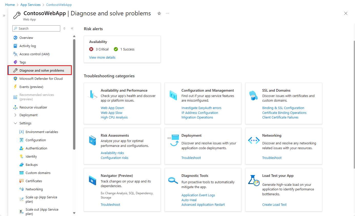 The page for App Service diagnostics offers streamlined diagnostic access in multiple sections.