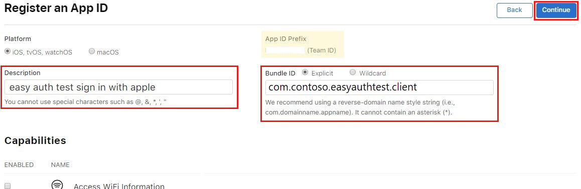 From the capabilities list, select Sign in with Apple Then select Continue. Take note of your App ID Prefix (Team ID) from this step. You need it later.