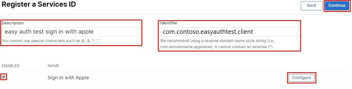 The description is what the user sees on the consent screen. The identifier is your client ID used in configuring the Apple provider with your app service.