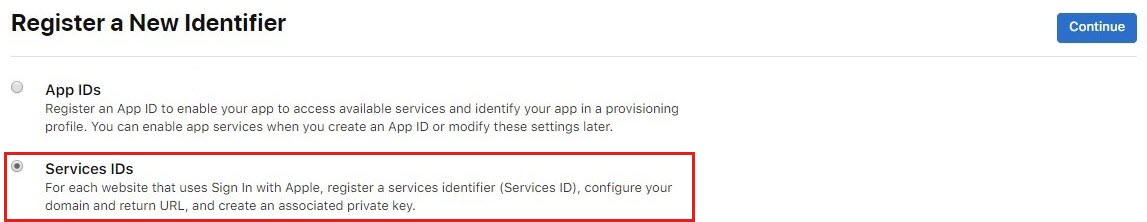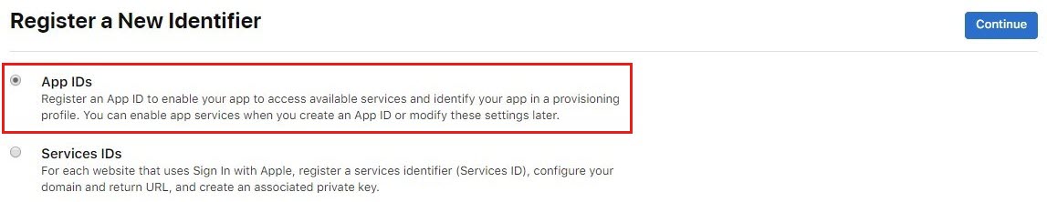 On the Register a New Identifier page, choose App IDs and select Continue. App IDs include one or more Service IDs.