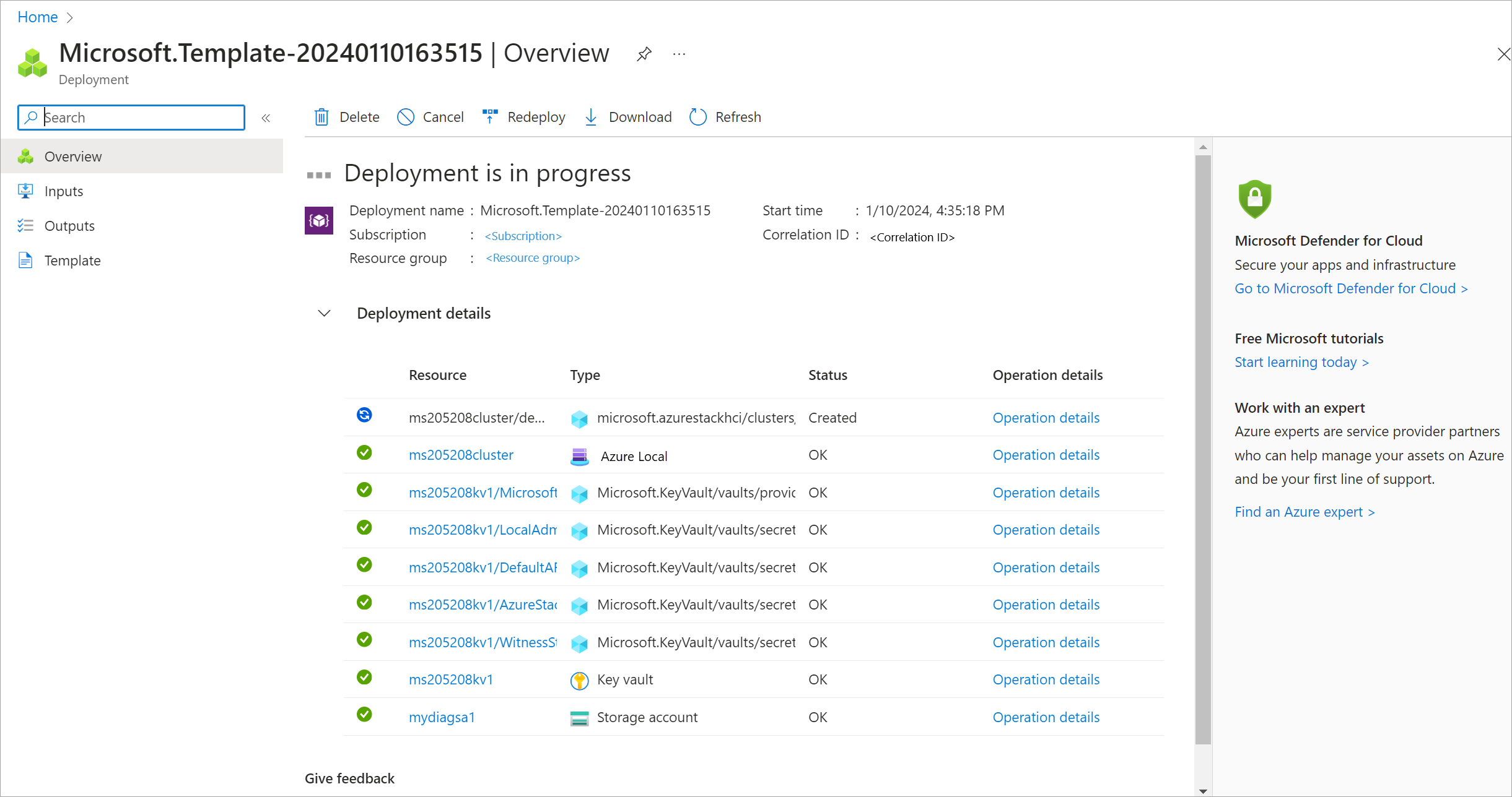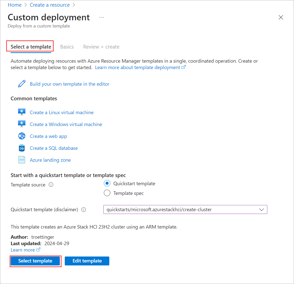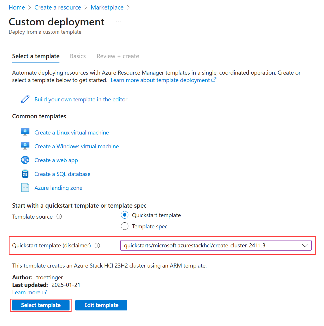 - For Azure Local 2503 and later versions, make sure to select the create-cluster template for deployment.