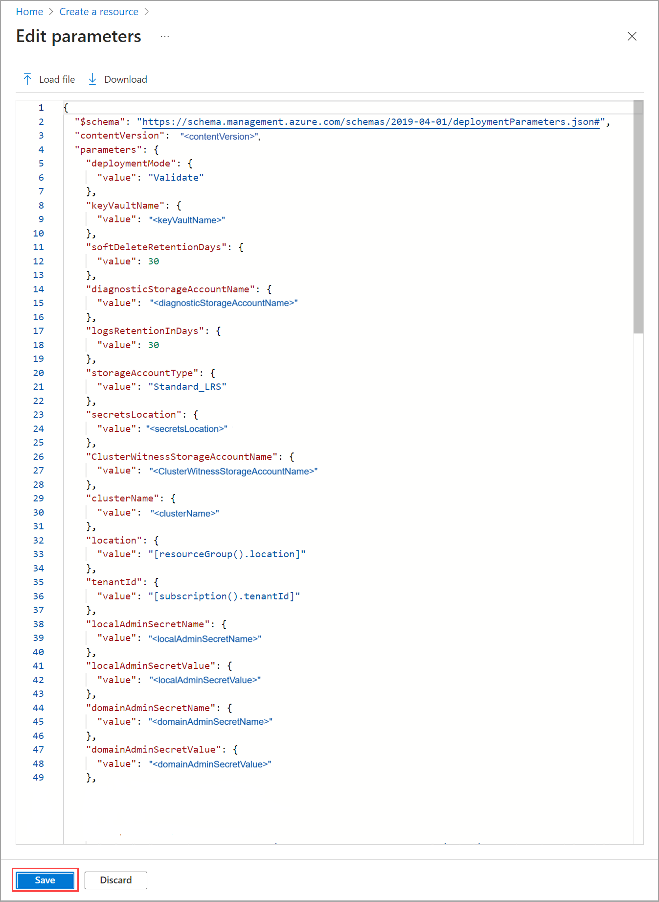 For an example of a parameter JSON file, see azuredeploy.parameters.json. For detailed descriptions of the parameters defined in this file, see ARM template parameters reference.