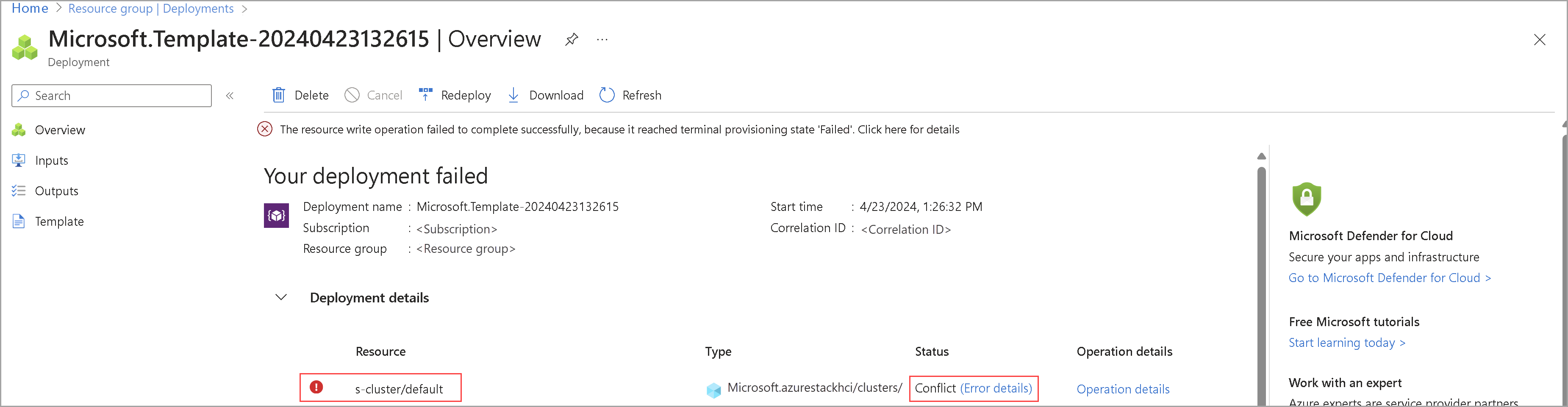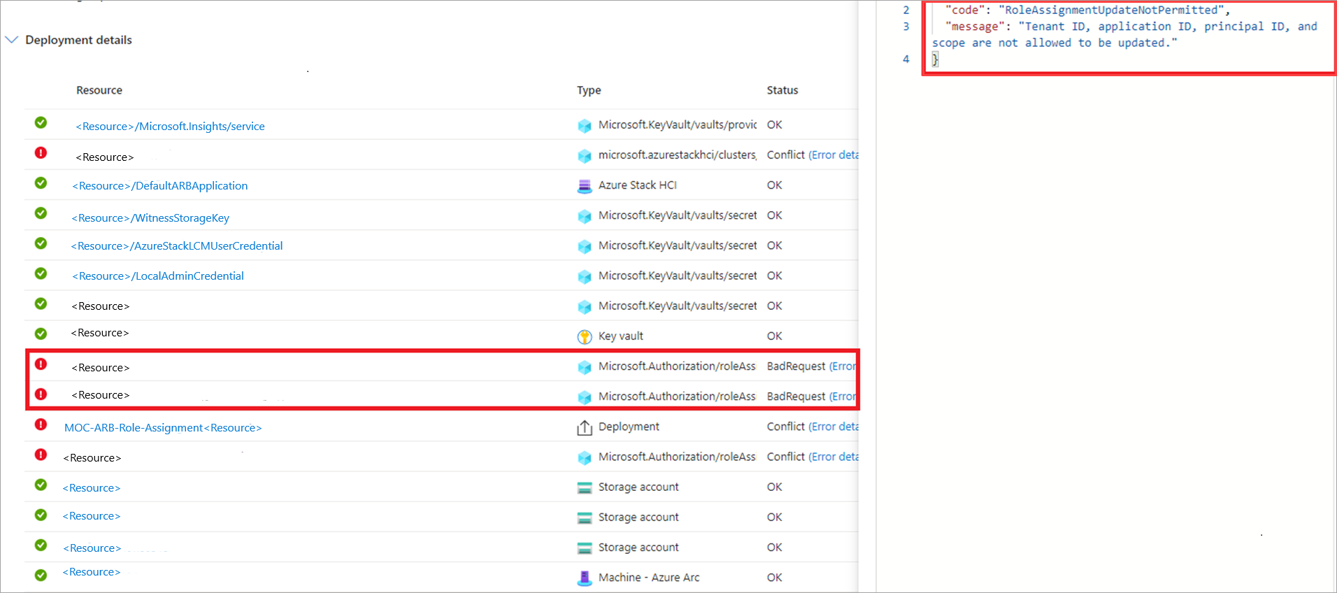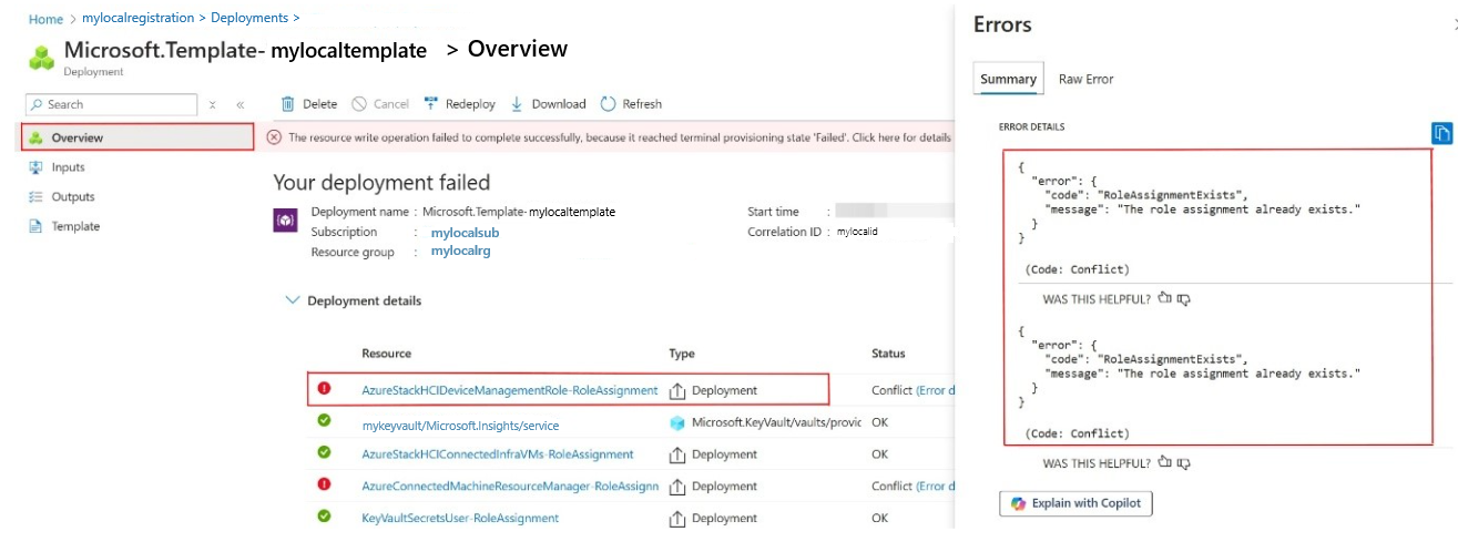 Issue: In this release, you may see Role assignment already exists error. This error occurs if the Azure Local instance deployment was attempted from the portal first and the same resource group was used for ARM template deployment. You see this error on the Overview > Deployment details page for the applicable resource. This error indicates that an equivalent role assignment was already done by another identity for the same resource group scope and the ARM template deployment is unable to perform role assignment.