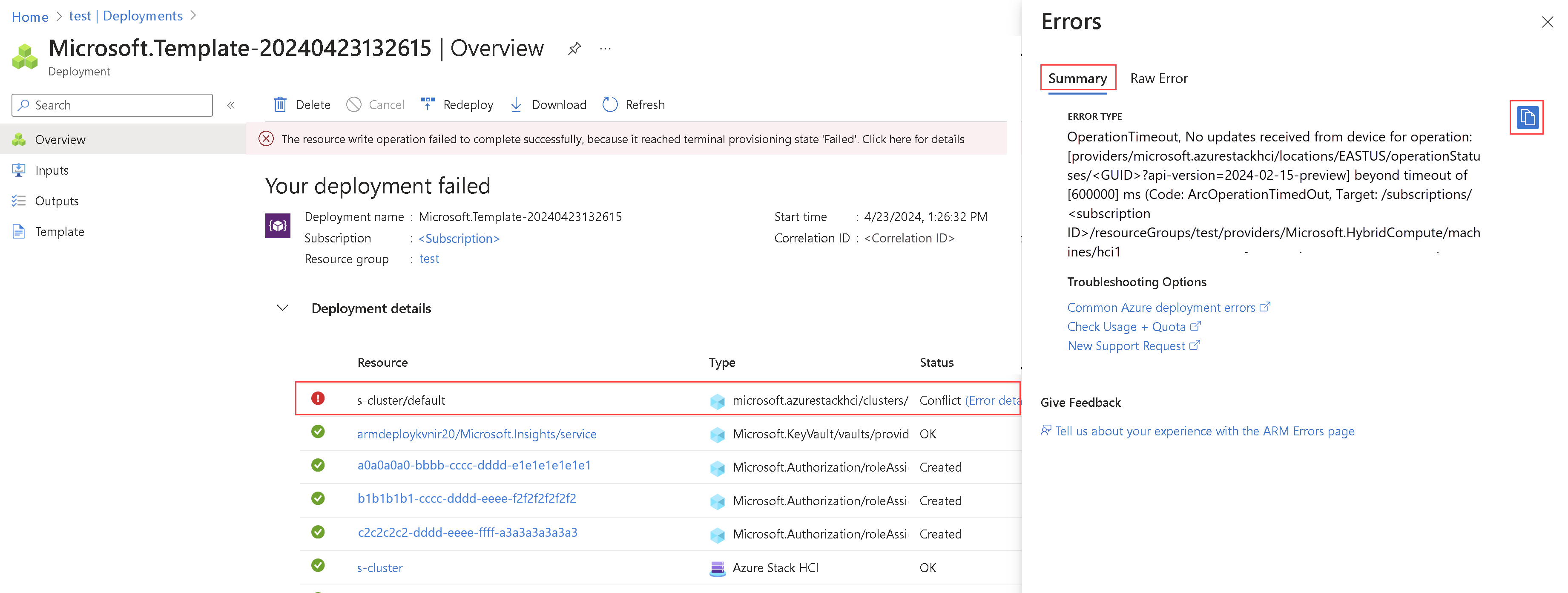 Workaround: The failed resource on the Deployment details page specifies the role assignment name. If the resource name is AzureStackHCIDeviceManagementRole-RoleAssignment then role assignment failed for the Azure Stack HCI Device Management Role. Note this role name and go to Resource Group > Access Control (IAM) > Role Assignments. Search for the corresponding name and delete the existing role assignments there. Redeploy your template.
