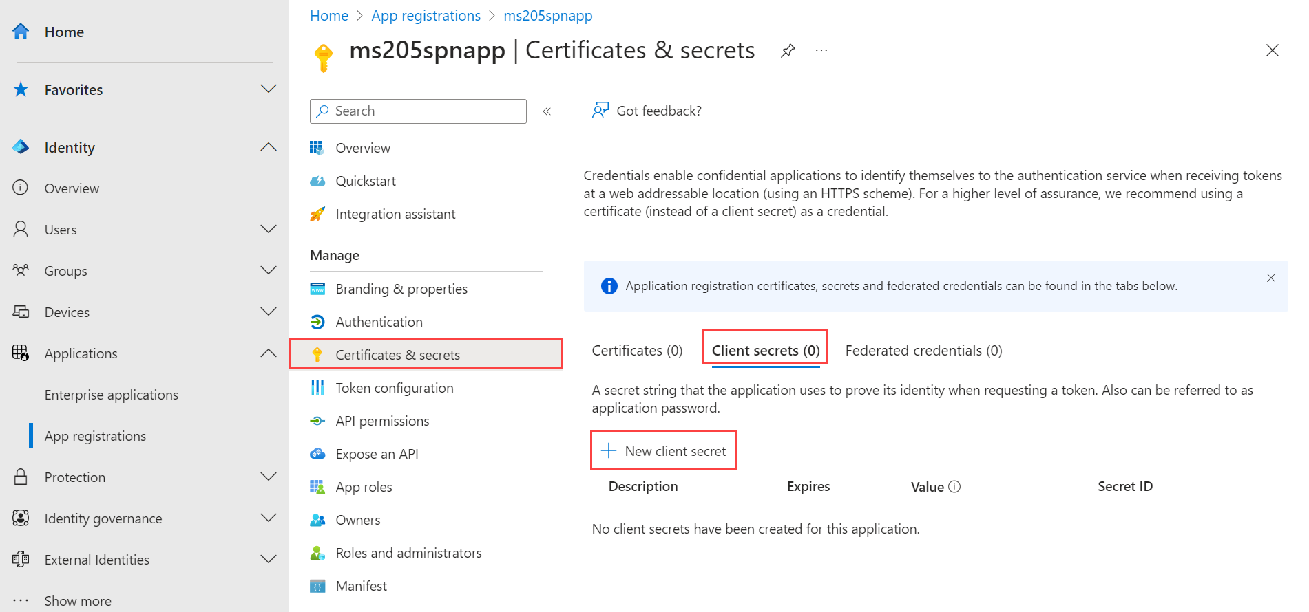 Go to the application registration that you created and browse to Certificates & secrets > Client secrets.