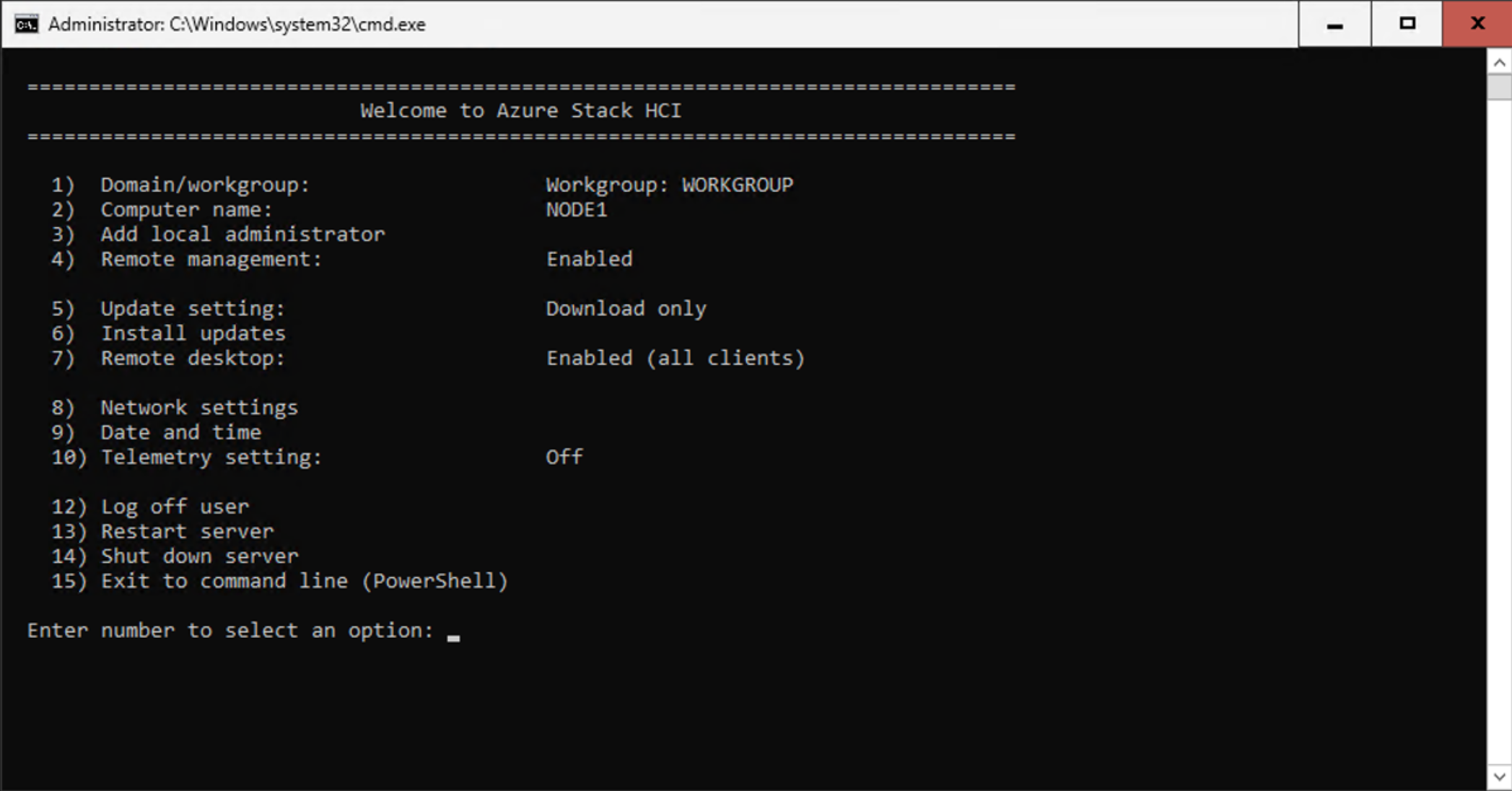 To use SConfig, sign in to the machine running the Azure Stack HCI operating system. This could be locally via a keyboard and monitor, or using a remote management (headless or BMC) controller, or Remote Desktop. The SConfig tool opens automatically when you sign in to the machine.
