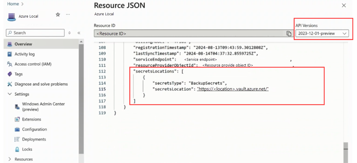 Invoke-AzRestMethod -Path "/subscriptions/<subscriptionId>/resourceGroups/<resourceGroupName>/providers/Microsoft.AzureStackHCI/clusters/<clusterName>/updateSecretsLocations" -Method POST -Payload { "properties": { "secretsType": "BackupSecrets", "secretsLocation": "https://hcikeyvaulttestingnew.vault.azure.net/" } } # Response: 200 OKValidate configuration. In the Azure portal, open the system resource and verify that Resource JSON includes the updated Key Vault details.