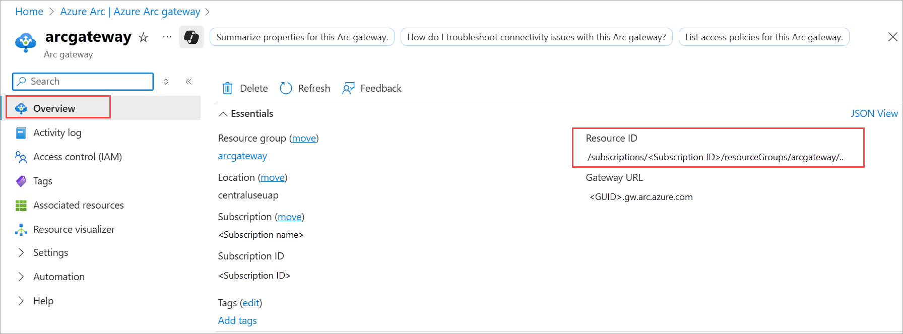 Screenshot of the Resource ID in the Overview page for Azure Arc gateway.