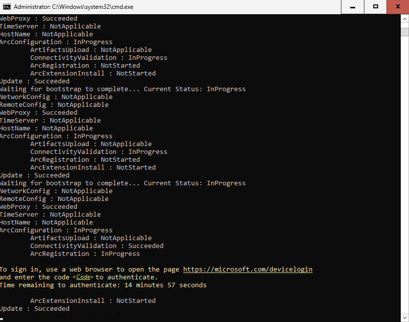 2. During the Arc registration process, you must authenticate with your Azure account. The console window displays a code that you must enter in the URL, in order to authenticate. Follow the instructions to complete the authentication process.