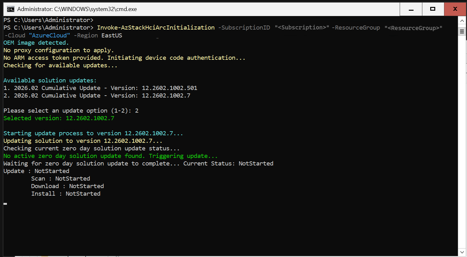 During Azure Arc registration, Azure Local verifies whether the OS image is current for its release baseline. If the image is outdated or unsupported, the system automatically detects it during initialization and provides a list of available update versions to select from. You can proactively specify a target solution version using the optional TargetSolutionVersion parameter.