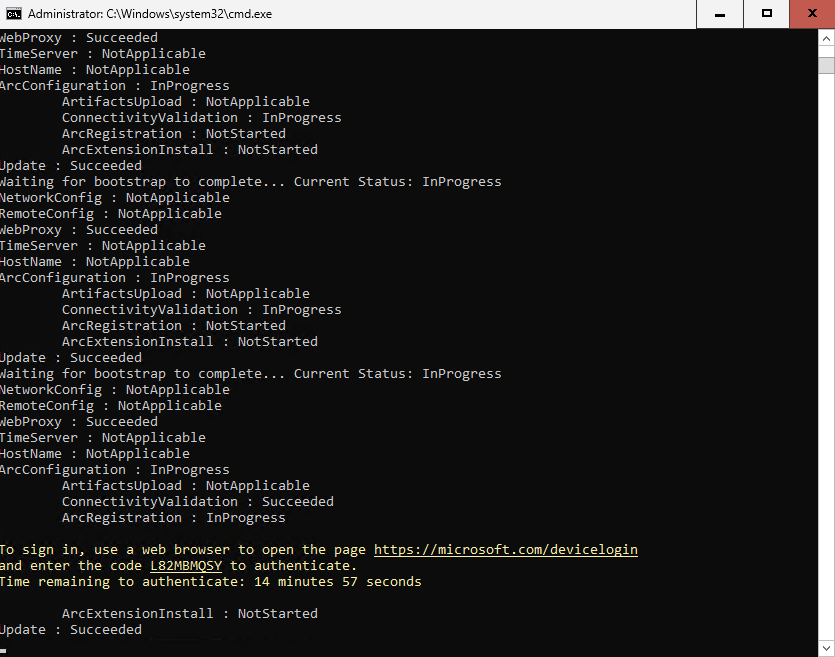 PS C:\Users\Administrator> Invoke-AzStackHciArcInitialization -TenantId $Tenant -SubscriptionID $Subscription -ResourceGroup $RG -Region $Region -Cloud "AzureCloud"