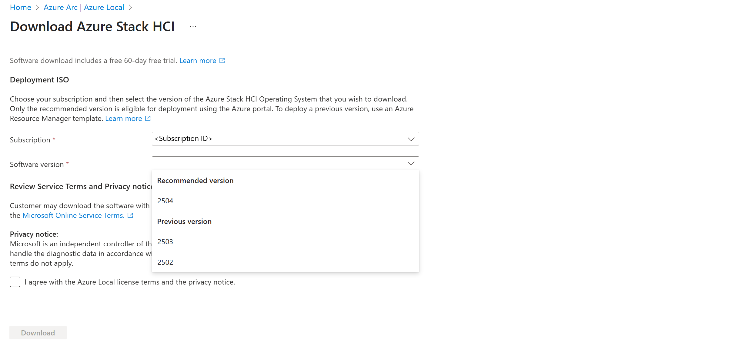 This article describes how to download the operating system (OS) software from the Azure portal to deploy an Azure Local instance.