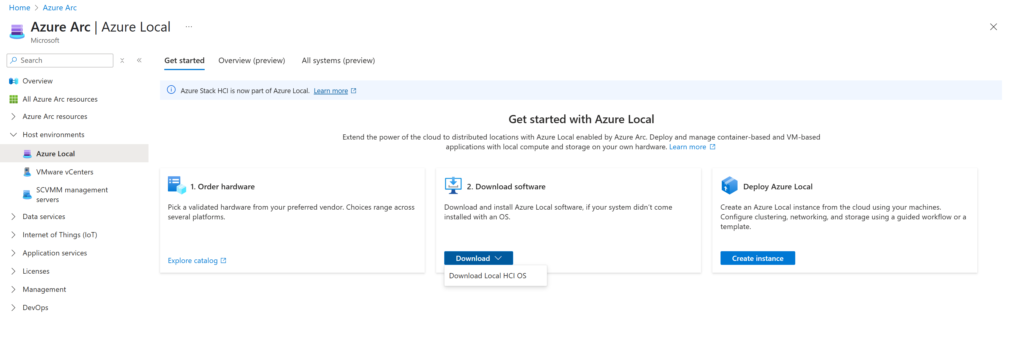The first step in deploying Azure Local is to download the OS from the Azure portal. The software download includes a free 60-day trial. However, if you've purchased Integrated System solution hardware from the Azure Local Catalog through your preferred Microsoft hardware partner, the OS should be preinstalled. In that case, you can skip this step and move on to Register your machines and assign permissions for Azure Local deployment.