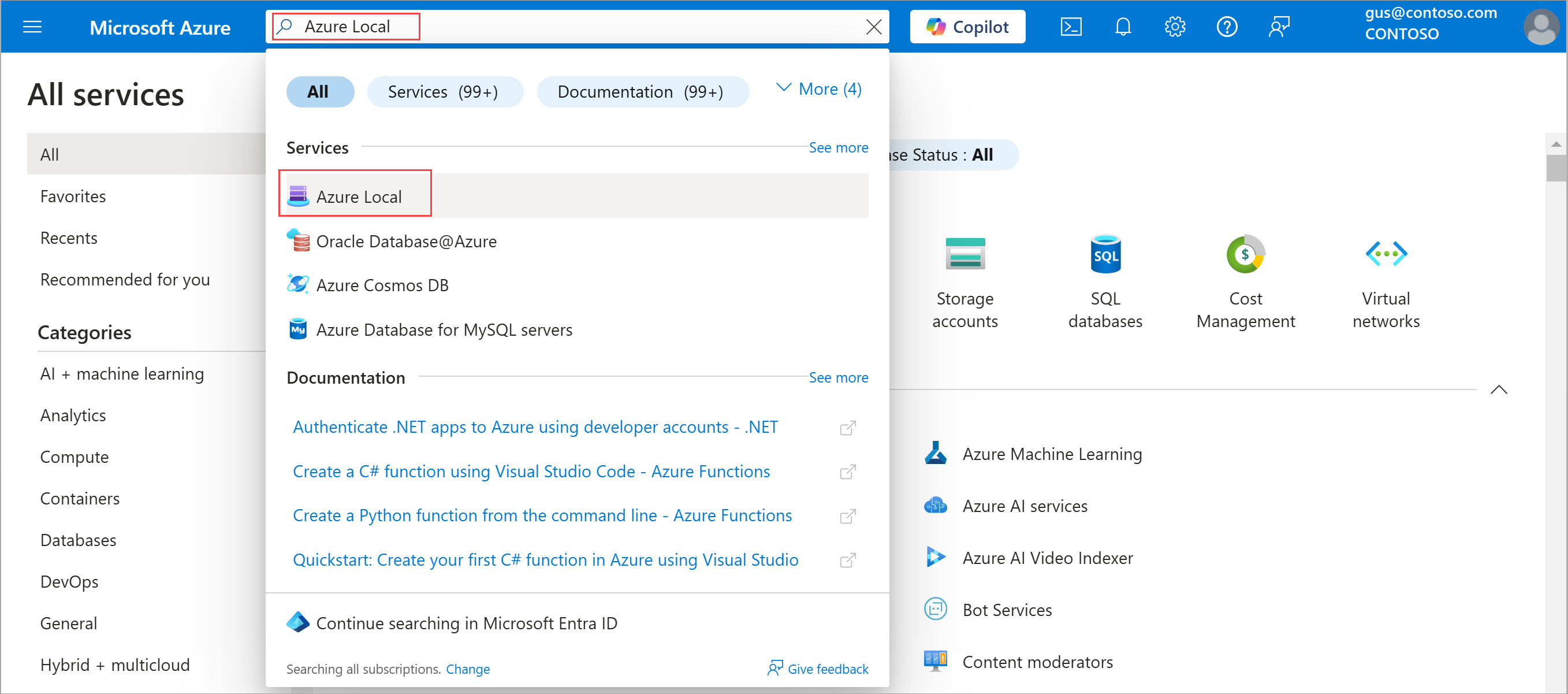 In the Azure portal search bar at the top, enter Azure Local. As you type, the portal starts suggesting related resources and services based on your input. Select Azure Local under the Services category.