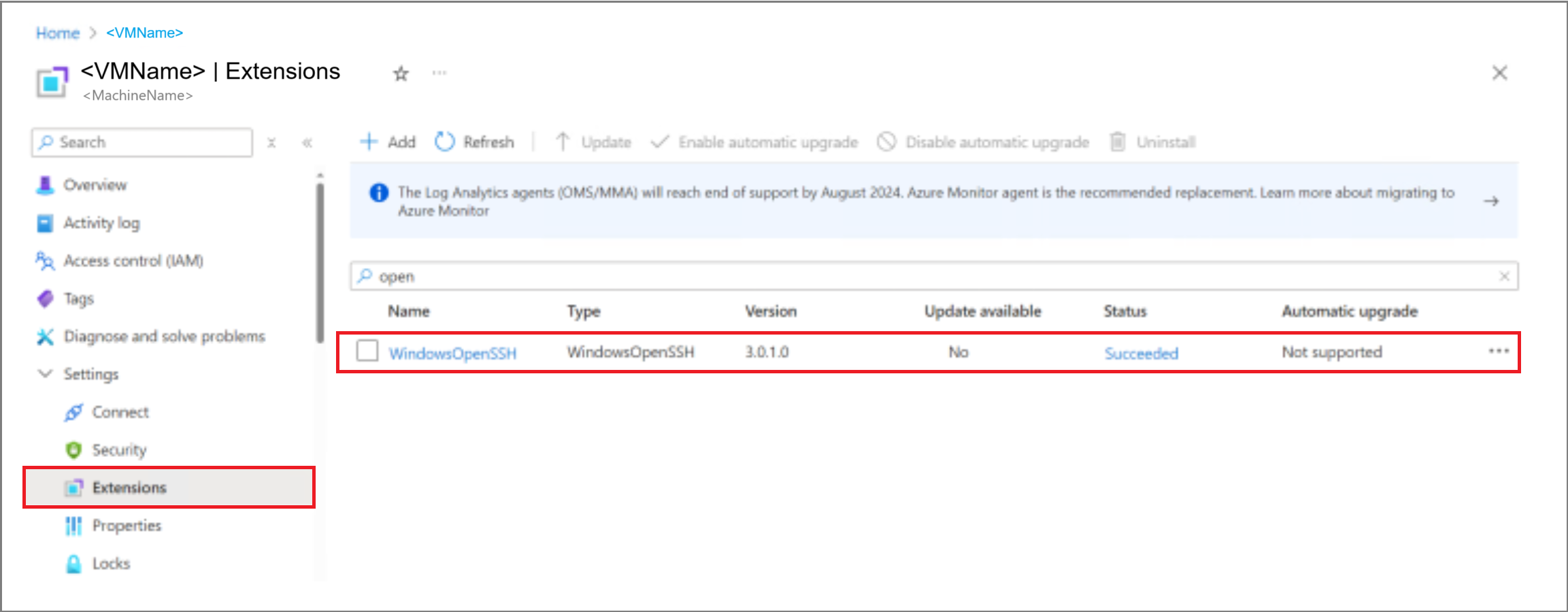 Install the OpenSSH server extension via Azure portal or via PowerShell. We recommend that you install the extension via Azure portal.