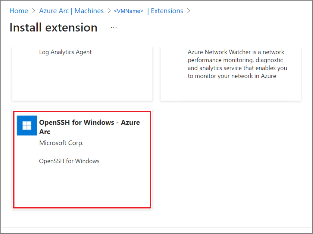 To install the extension through Azure portal, go to Extensions and select the OpenSSH for Windows - Azure Arc option.
