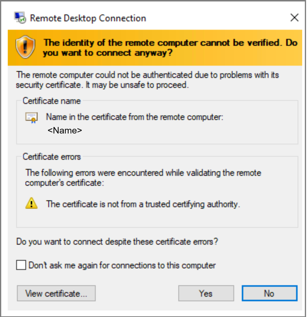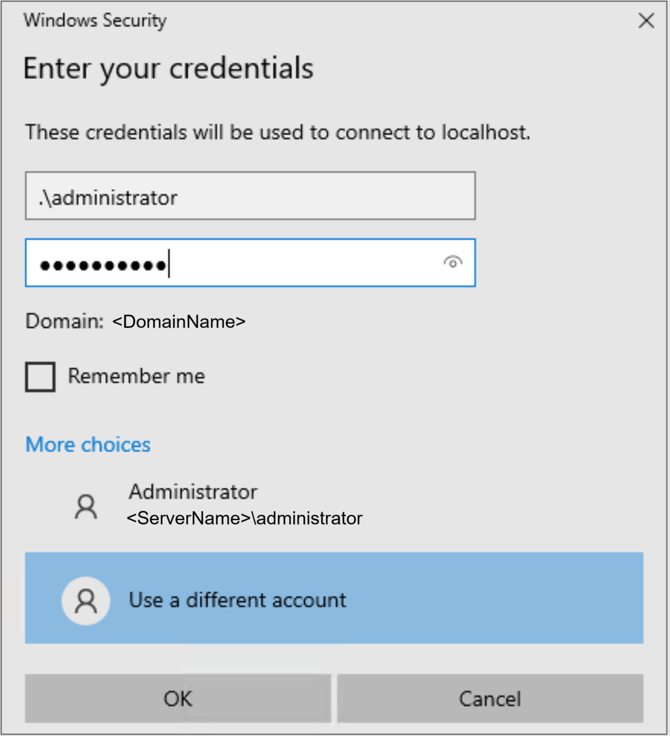 - The second prompt authenticates to the VM itself. Use the credentials of a local administrator account on the VM.
