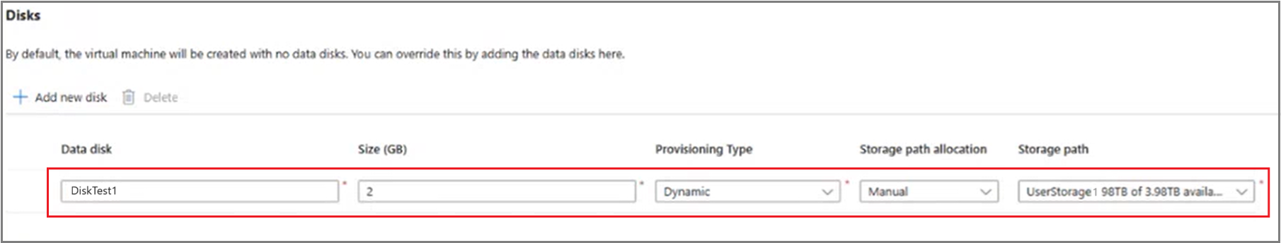 az stack-hci-vm disk create --resource-group $resource_group --name $diskName --custom-location $customLocationID --location $location --size-gb 1 --dynamic true --storage-path-id $storagePathidAttach the disk to the VM: