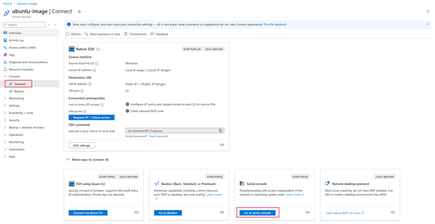 After the VM is deployed, go to the VM overview page, select the Connect option, and then select Serial console.