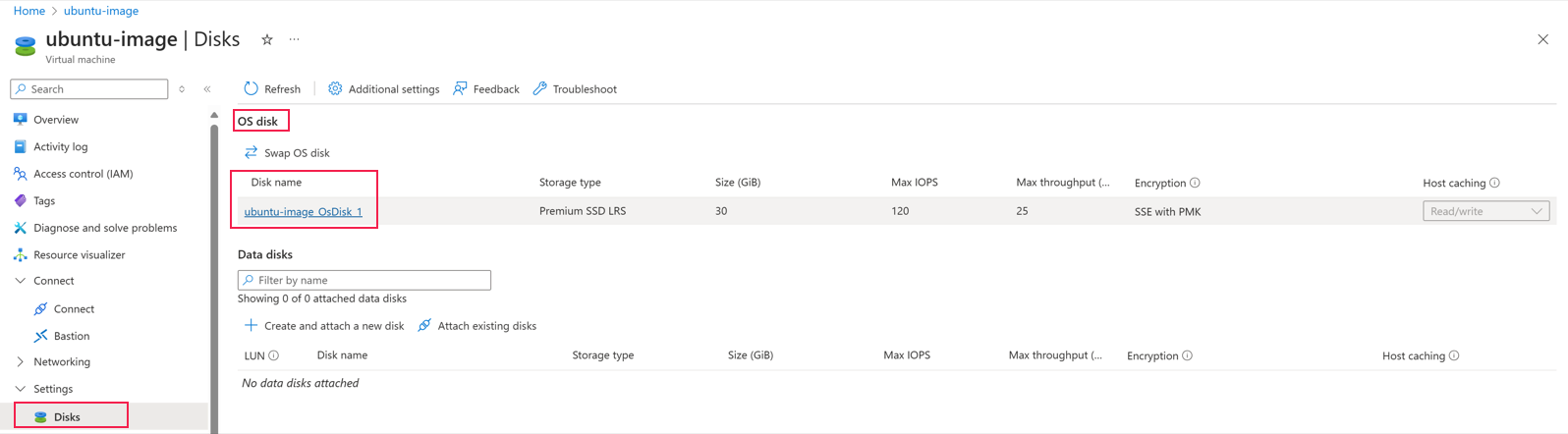 In the Azure portal for your Azure Local resource, go to the VM overview. Under the Settings option, select Disks, and select the Disks name link.