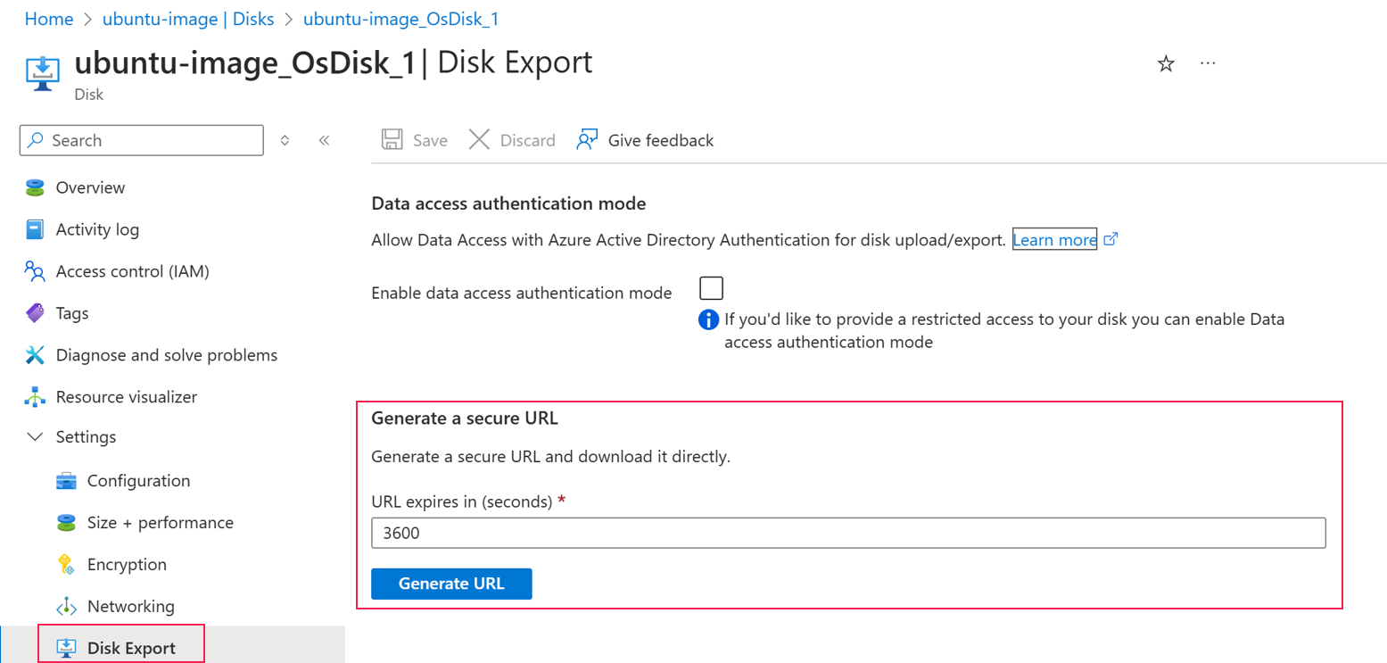 Under Settings, select Disk Export, and then select Generate URL to generate a secure URL for the disk.