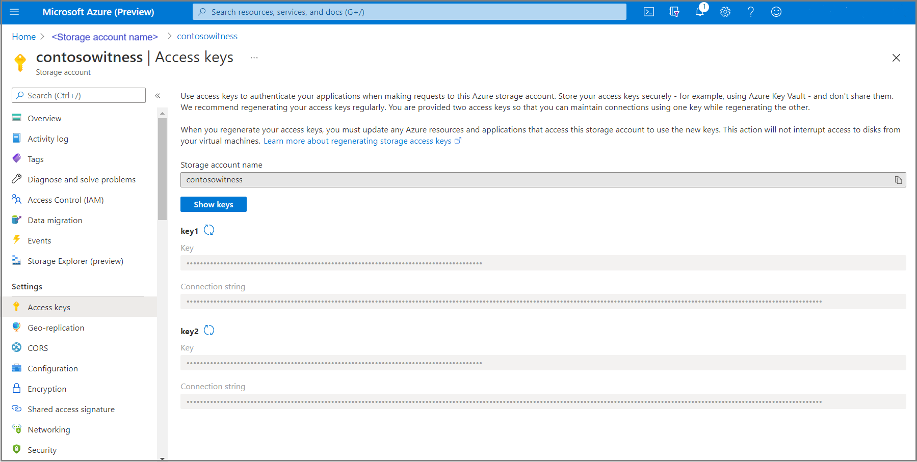 In the Azure portal, under Settings, select Access keys.