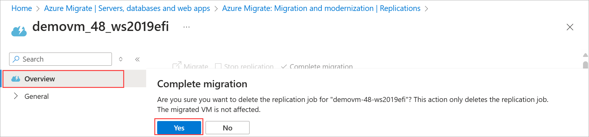 From the top command bar, select Complete migration. When prompted for confirmation, select Yes to continue.