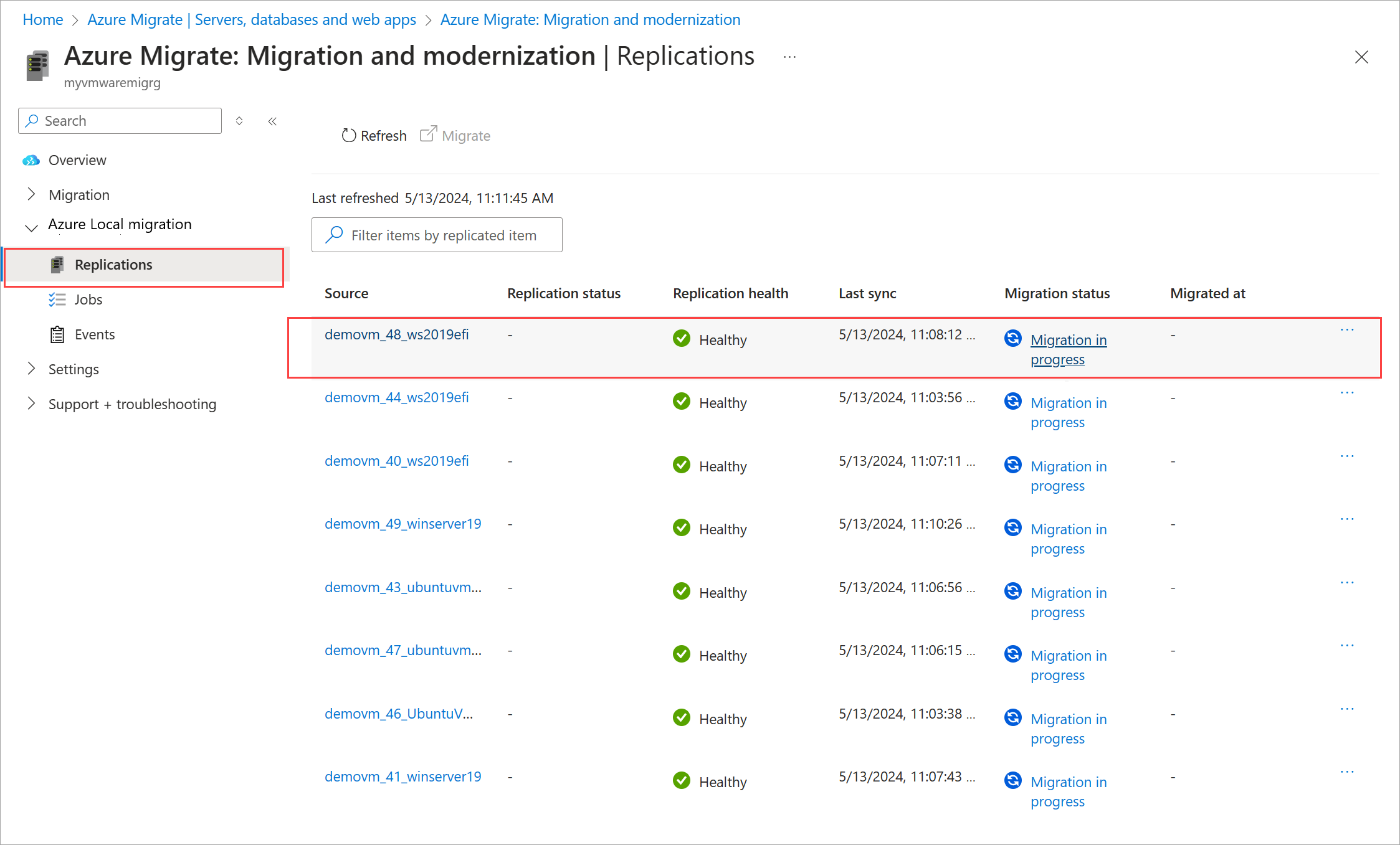 After the migrated resource is deleted, it's also removed from the Replications view. The source VM is no longer protected, and you can enable replication again for the same source VM if needed.