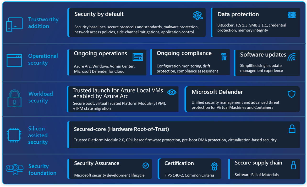 The Azure Local security book discusses in detail the built-in security layers found in Azure Local, from core to cloud.