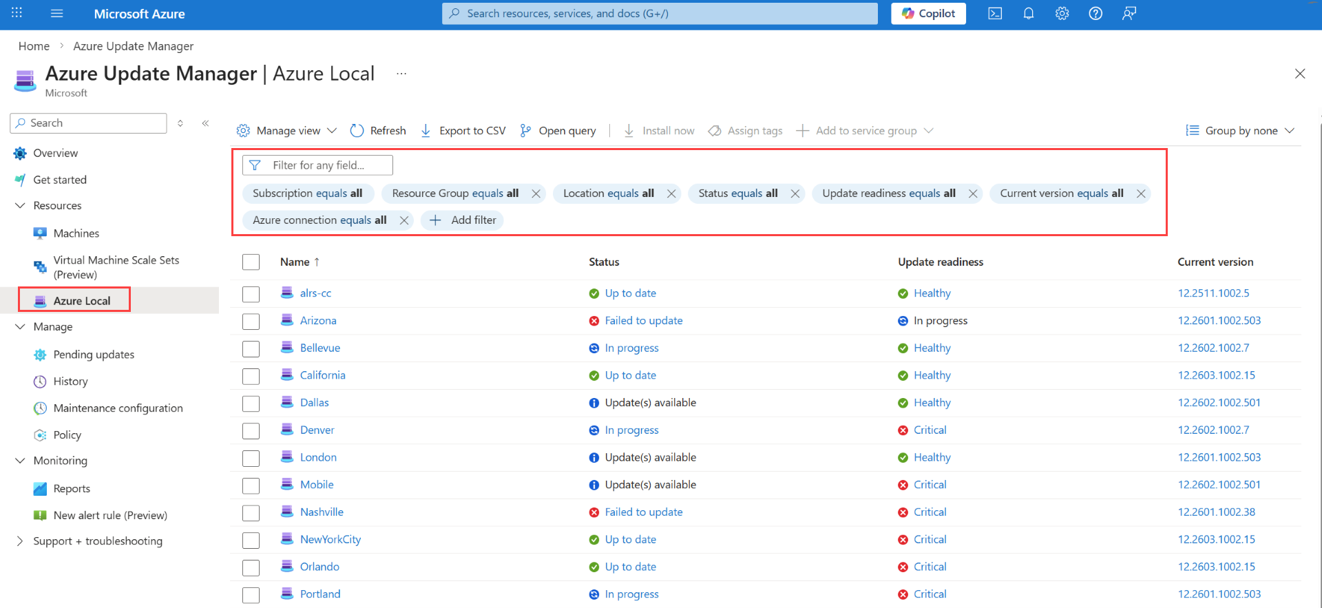 AUM provides a centralized view to apply and manage updates across all Azure Local instances. In the Azure portal, go to Azure Update Manager > Resources > Azure Local.