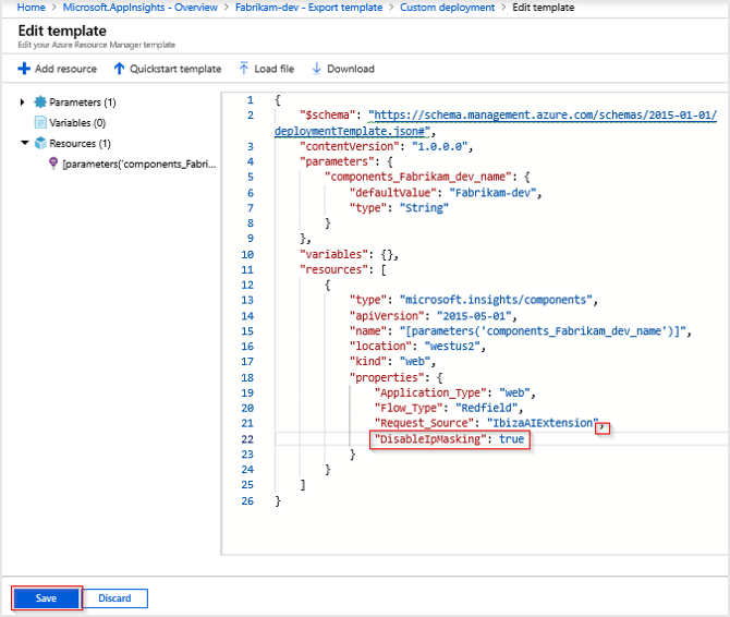 propertiesinsideresources. Add a comma to the last JSON field, and then add the following new line:"DisableIpMasking": true. Then select Save.Select Review + create > Create.