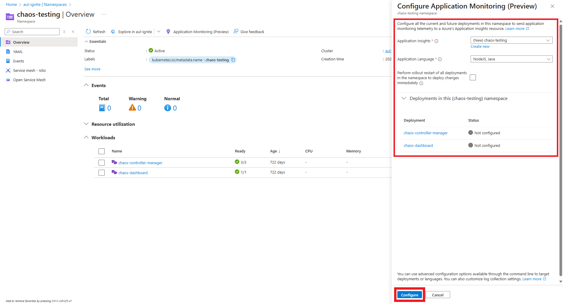 AKS Clusters can be prepared for this feature during cluster creation. Run the following Azure CLI command if you prefer to have the cluster prepped during creation. Application monitoring isn't enabled just because your cluster is prepped. You must deploy an application and onboard the application to this feature.