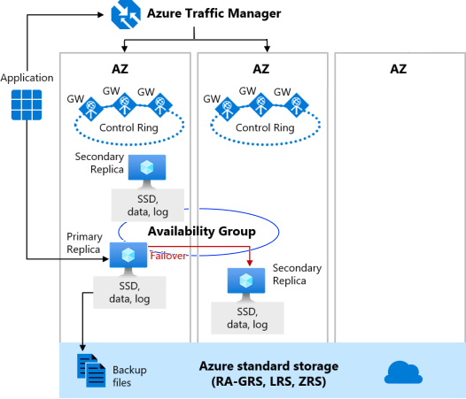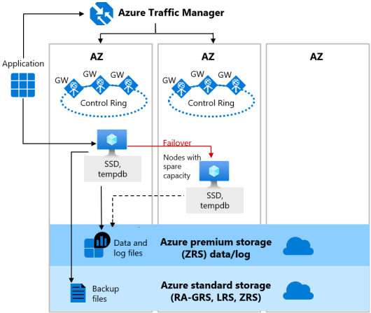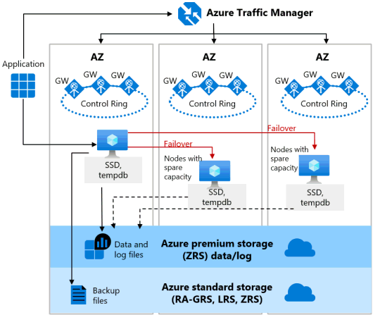 • A stateful data layer with the database files (.mdf/.ldf) that are stored in ZRS (zone-redundant storage). Using ZRS, the data and log files are synchronously copied across multiple Azure availability zones in the primary region. This is across two or three zones, as selected by Azure SQL for optimal resilience.