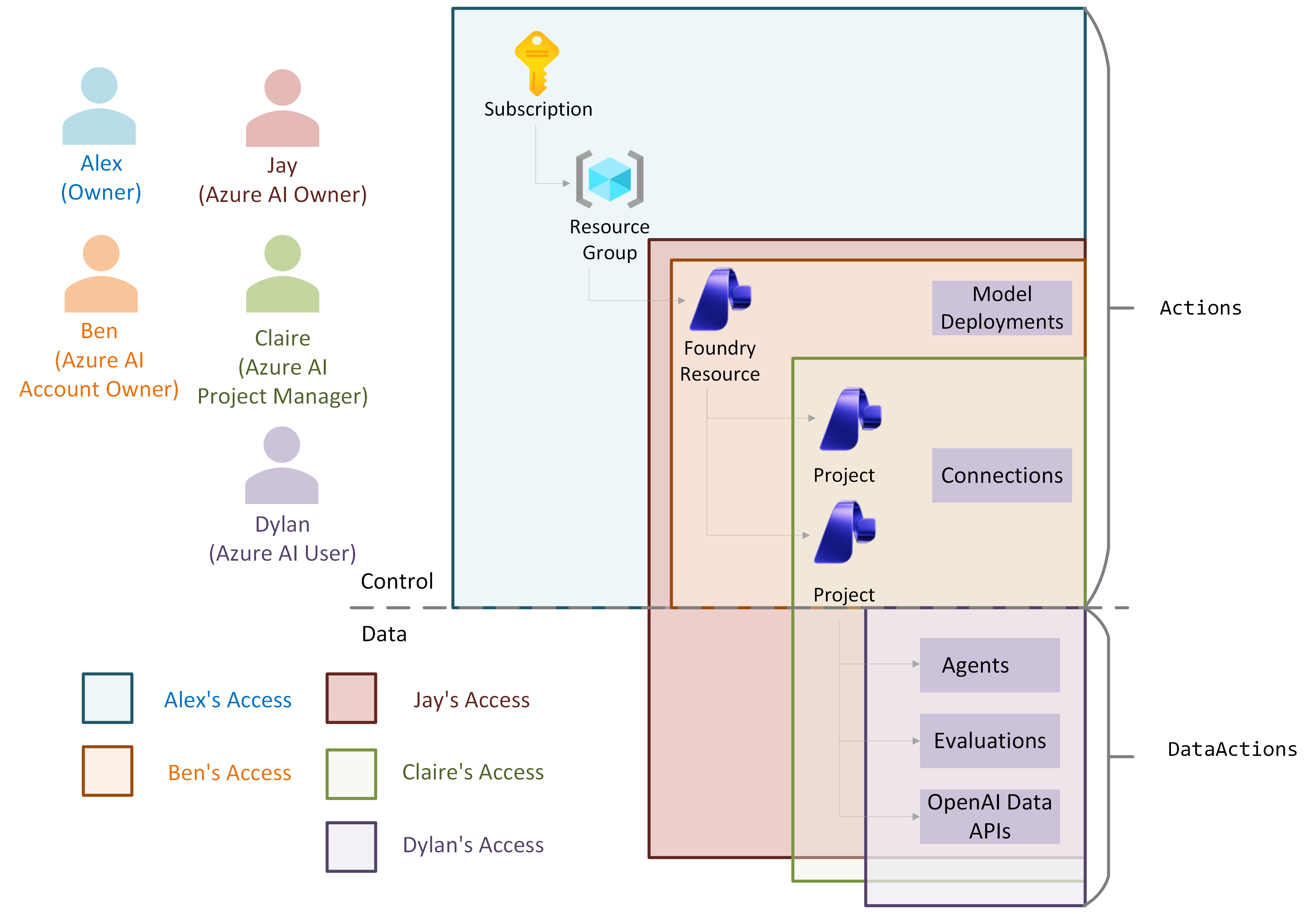 Azure Role Based Access Control (RBAC) differentiates permissions between management and development actions. To build with Foundry, your user account must be assigned developer permissions ("data actions"). You can either use one of the built-in RBAC roles, or use a custom RBAC role.