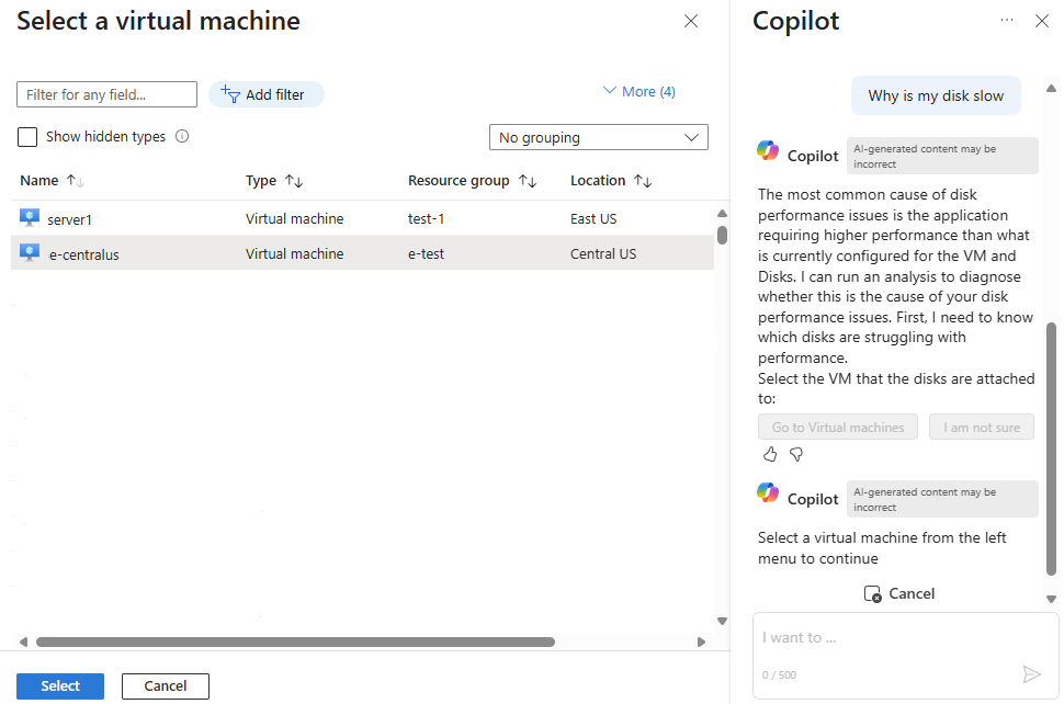 After you select a VM, you're prompted to select one or more disks for Copilot in Azure to analyze.