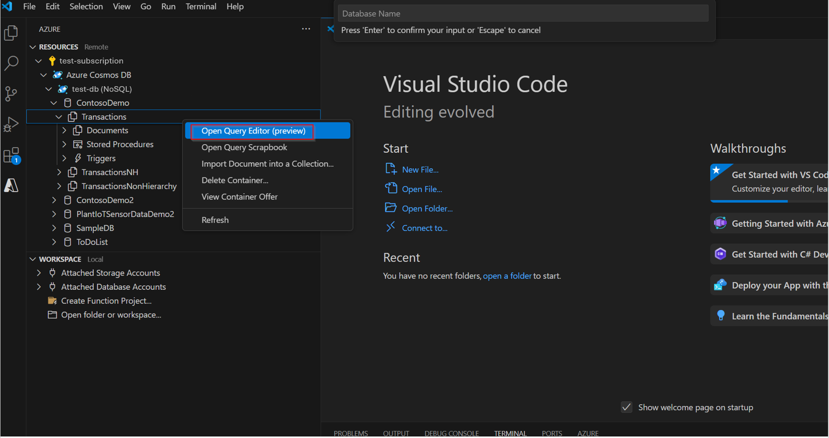 Create and Drop Databases/Collections: Create or delete databases and collections using the context menu on your account, database, or collection in the resource panel.