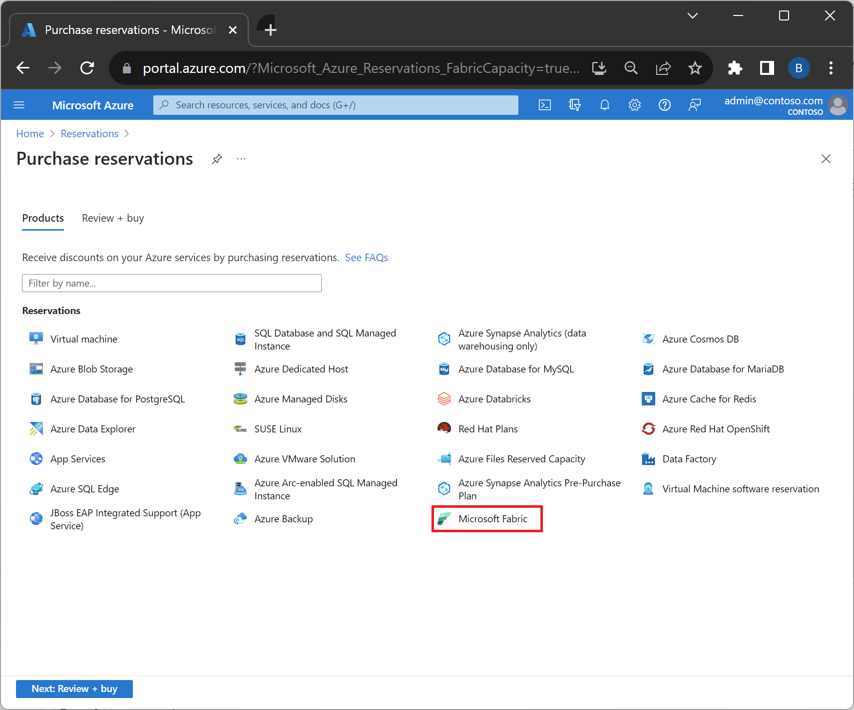 - On the Select the product you want to purchase page, select the Fabric capacity reservation to buy, add to cart, then select Next: Review.
